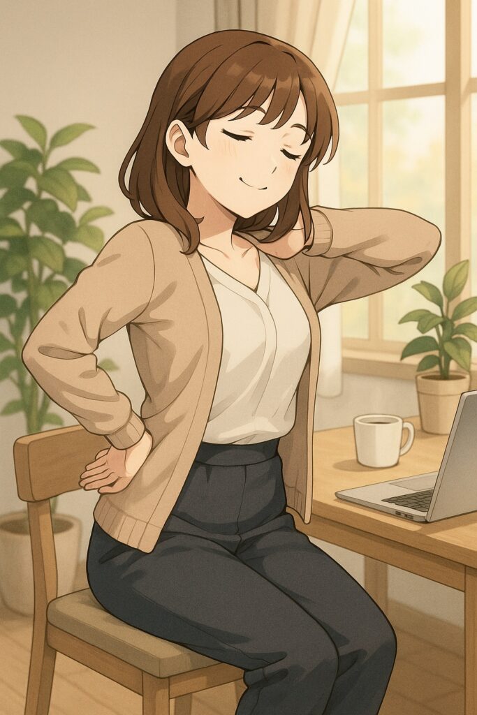この姿勢が続くと、血流が悪くなり、肩こり・首の重さが慢性化しやすくなります。