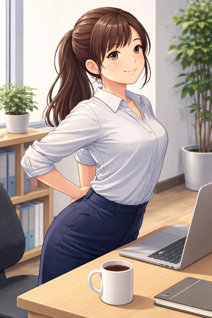 前かがみ姿勢が続くと首や肩の筋肉が緊張しやすくなります。特に猫背姿勢になると首への負担が増え、血流が悪くなり疲れが抜けにくくなることもあります。姿勢を整えることは、体の負担を減らす大切なポイントです。