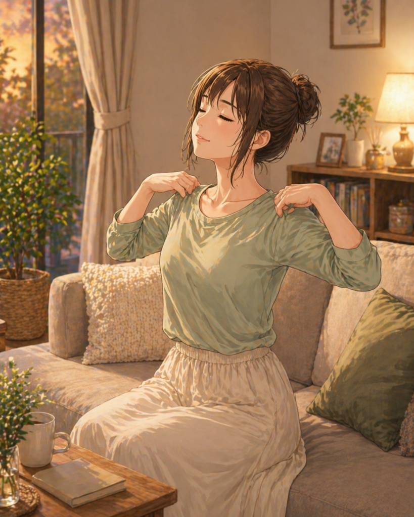 猫背姿勢が続くと首や肩まわりの筋肉が緊張しやすくなります。その状態が続くことで血行が滞りやすくなり、疲れが抜けにくい状態につながることもあります。